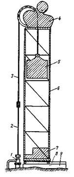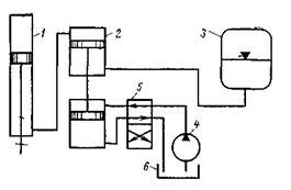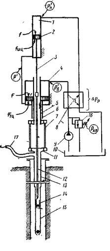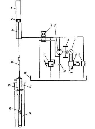 Установка включает силовой орган – гидроцилиндр ( ), шток которого соединен с колонной штанг. Его нижняя полость соединена с верхней полостью верхнего промежуточного цилиндра ( ), а подпоршневая полость последнего с газовым аккумулятором ( ). Полости нижнего промежуточного цилиндра через силовой распределитель ( )попеременно соединяются с силовым насосом ( ) и баком ( ).