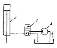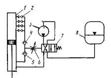 Гидроприводные установки с закрытой схемой включают силовой орган – гидроцилиндр ( ), пневматический аккумулятор ( ), блок привода – силовой насос ( ) и распределительный золотник ( ), гидродавленческую систему реверсирования состоящую из кранов ( ), обратных клапанов ( , ) и регулируемого дросселя ( ), подключенного к золотнику ( ).