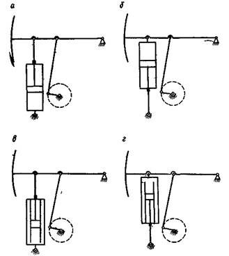 а – с подвижным поршнем без гидравлического затвора; б – с подвижным цилиндром без гидравлического затвора; в – с подвижным поршнем и гидравлическим затвором; г – с подвижным цилиндром с гидравлическим затвором.