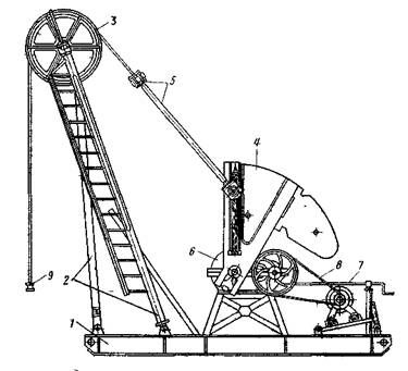 Наиболее близкой к таким установкам является станок-качалка в котором балансир и шатун заменяются канатом, переброшенным через шкив, причем один конец его соединяется с кривошипом, а второй – с устьевым штопом. Кривошипы безбалансирных станков-качалок имеют V-образную форму, обеспечивающую уравновешивание привода.