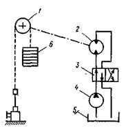 В установках с грузовым уравновешиванием в качестве аккумулятора энергии используется груз. Установка включает ферму, в верхней части которой располагается шкив ( ) с перегнутым через него канатом (или цепью). Шкив приводится в действие высокомоментным резервным гидромотором ( ), рабочая жидкость к которому поступает от силового насоса ( ) через распределитель ( ).