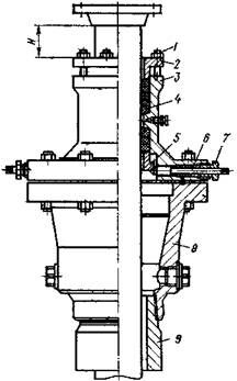 1 – шпилька; 2, 5 – грундбукс; 3 – корпус сальника; 4 – сальниковая набивка; 6 – запорный болт; нажимная гайка; 8 – верхний фланец корпуса головки; 9 – переводник.