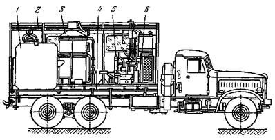 1 – цистерна с водой; 2 – кузов; 3 – парогенератор; 4 – рама; 5 – приводная группа; 6 – питательный насос.