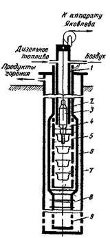 1 – устьевое оборудование; 2 – колонна НКТ; 3 – запальное устройство; 4 – конусное гнездо; 5 – камера сгорания; 6 – кожух; 7 – экс­плуатационная колонна; 8 – замковая опора; 9 – фильтр