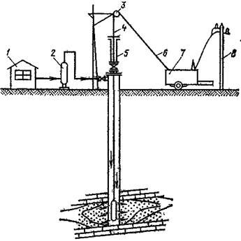 1 – компрессорная; 2 – воздушный затвор; 3 – направляющий блок; 4 – сальник; 5 – лубрикатор; 6 – электрокабельтрос; 7 – станция управления; 8 – источник электропитания