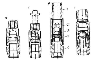 а—насоса НГН1; б—насоса НГН2, в — насоса НГНЗ; 1— корпус, 2 — стакан- 3 — шарик, 4 — седло; 5 — наконечник-конус; г — конструкция Костыченко