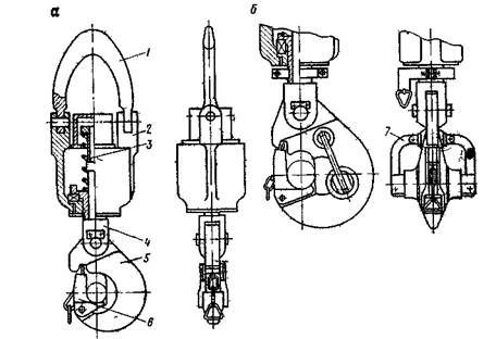 а – однорогий крюк; б – трехногий крюк; 1 – серьга; 2 – корпус; 3 – пружина; 4 – ствол; 5 – рог крюка; 6 – запор крюка; 7 – дополнительные рога.