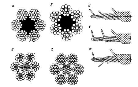 а – г – стальные канаты с сердечником; д – в одностороннем направлении с одинаковым углом свивки и линейным контактом проволок; е – с одинаковым шагом свивки всех проволок; ж – с разным направлением свивки и точечным контактом проволок.