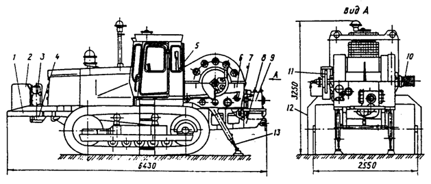 1 – рама; 2 – топливный бак; 3 – воздушные баллоны; 4 – компрессор; 5 – пульт управления; 6 ‑ лебедка; 7 – карданный вал; 8 – консольная рама; 9 – коробка передач; 10 – безопасная катушка; 11 – механизм привода ротора; 12 – съемная приставная лестница; 13 – откидной винтовой упор