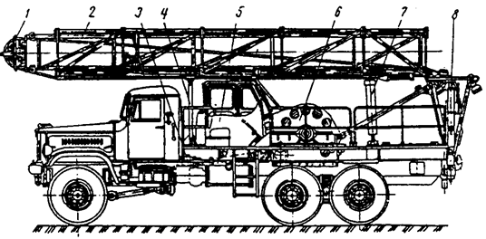 1 – талевая система; 2 – вышка; 3 – силовая передача; 4 – передняя опора; 5 – кабина оператора; 6 – лебедка; 7 – гидроцилиндр подъема вышки; 8 – задняя опора