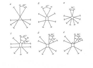 Рис. 15- Типовых вариантов систем заякоривания: а,б,в – симметричные системы соответственно с n-9,8,10; г,д,е – системы с якорными канатами (n =8), расположенными соответственно под углом 45-900 друг к другу, порд углом 30-700 к оси платформы и под углом 30-600 к продольной оси судна