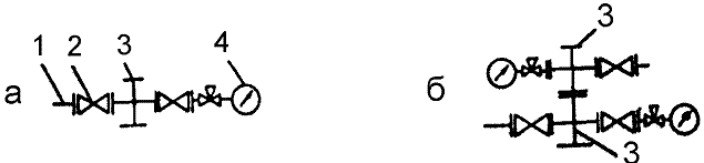 1 - ответный фланец; 2 - запорное устройство; 3 - трубная головка; 4 - манометр с запорно‑разрядным устройством