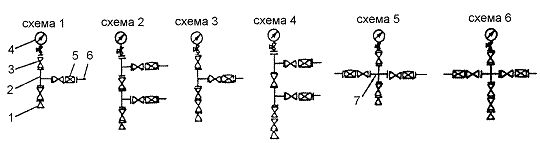 тройниковые - схемы 1,2,3 и 4; крестовые - схемы 5 и 6 (1 - переводник к трубной головке; 2 ‑ тройник; 3 - запорное устройство; 4 - манометр с запорно-разрядным устройством; 5 ‑дроссель; 6 - ответный фланец 7 - крестовина)