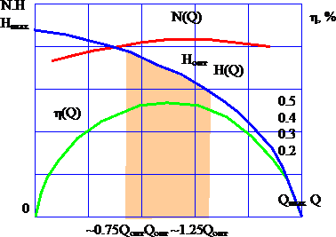 По кривым типовых характеристик погружных ЭЦН, дебиту по жидкости и требуемому напору выбирают несколько насосов, обеспечивающих необходимый отбор жидкости в области рабочих режимов работы насосов при условии: