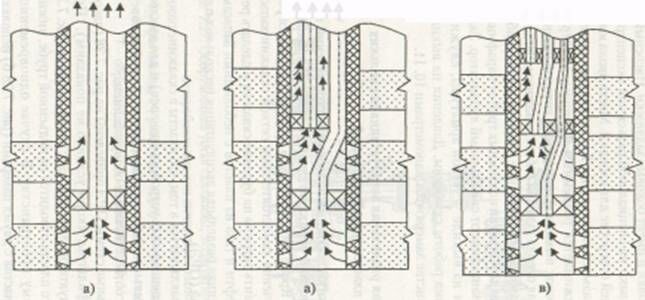 Например, схема насос-фонтан означает, что нижний пласт эксплуатируется насосным способом, а верхний — фонтанным.
