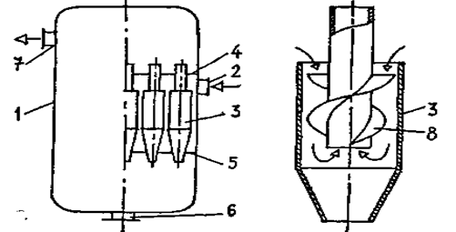 Схема, поясняющая работу циклонного пылеуловителя, приведена на рисунке 5.13. Газ входит в аппарат через патрубок 2 и попадает в батарею циклонов 3. Под действием центробежной силы твердые и жидкие частицы отбрасываются к периферии, затормаживаются о стенку циклона и выпадают в нижнюю часть аппарата, откуда выводятся через патрубок 6. А очищенный газ, изменяя направление движения, попадает в верхнюю часть аппарата, откуда выводится через патрубок 7.