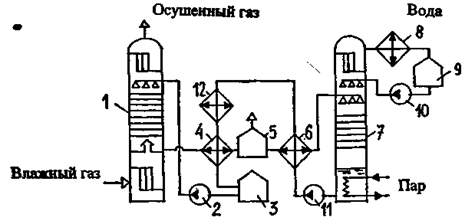 1 — абсорбер; 2, 10, 11 — насосы; 3, 9 — емкости; 4, 6 — теплообменники; 5 — выветриватель; 7 —десорбер; 8 — конденсатор - холодильник; 12 — холодильник