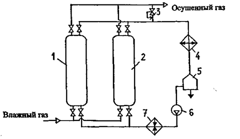 Технологическая схема осушки газа методом адсорбции приведена на рисунке 5.15. Влажный газ поступает в адсорбер 1, где он проходит снизу вверх через слой адсорбента — твердого вещества, поглощающего пары воды и далее выводится из аппарата. Процесс осушки газа осуществляется в течение определенного (12 ... 16 ч) времени. После этого влажный газ пускают через адсорбер 2, а адсорбер 1 отключают и выводят на регенерацию. Для этого через регулятор давления 3 типа «после себя» из газовой сети отбирается сухой газ, и воздуходувкой 6 подается в подогреватель 7, где газ нагревается до температуры 180 ... 200 0С. Далее он подается в адсорбер 1, где отбирает влагу от адсорбента, после чего поступает в холодильник 4. Сконденсировавшаяся вода собирается в емкости 5, а газ используется для осушки повторно и т. д. Процесс регенерации адсорбента продолжается 6 ... 7 ч. После этого в течение около 8 ч адсорбер остывает.