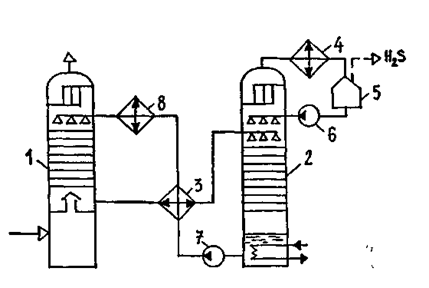 1 — абсорбер; 2 — выпарная колонна (десорбер); 3 — теплообменник; 4, 8 — холодильник; 5 — емкость - сепаратор; 6, 7 — насосы