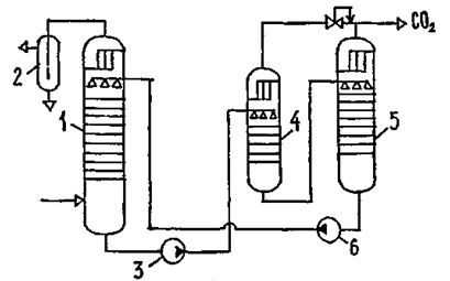 Вода, насыщенная углекислым газом, насосом 3 подается в экспанзер 4 для отделения СО2 методом разбрызгивания. Для полного удаления СО2 вода подается в дегазационную градирню 5, откуда насосом 6 возвращается в емкость 1.