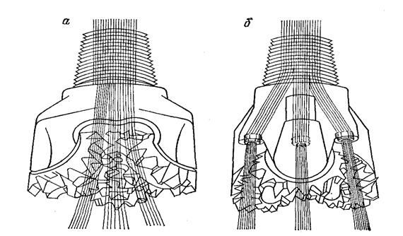 Рисунок 2.15 — Схема шарошечных долот с центральной (а) и боковой (гидромониторной) (б) промывкой