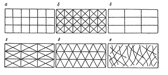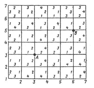 На соответствующую топографическую карту местности с учетом ко: коэффициента развития линии трубопровода наносят сетку (рис. 7): квадратная (а), квадратную с диагоналями (б), прямоугольную (в), прямоугольную с диагоналями (г), треугольную из равносторонних треугольников (д), производной формы (е). Прямоугольная сетка с диагоналями считается наиболее рациональной при направлении диагоналей от А к В и параллельно этой линии. Дуги сетки нумеруют в определенном порядке (1-7), создавая цифровую модель местности (рис. 8). В этом же порядке для каждой дуги определяют значение критерия оптимальности (1-4) и наносят его на сетку на тoпографической карте. При необходимости допускается некоторое искривлене первоначальных дуг (обход болота, озера, населенного пункта) и разделен дуг на отдельные участки, соответствующие различным категориям местности.