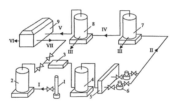 1 - газовая скважина высокого давления; 2,4,8 - газовый сепаратор; 3 - теплообменник; 5 - газораспределительная батарея; 6 – газлифтная скважина; 7 - газонефтяной сепаратор; 9 - компрессорная станция