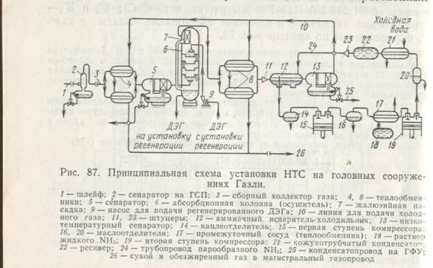 Осушку и выделение конденсата из газа с применением искусственного холода можно осуществлять на компрессорных и абсорбционных установках. Здесь приведем лишь принципиальную схему и разберем работу компрессорной холодильной установки. На рис. 87 приведена принципиальная схема установки НТС на головных сооружениях Газли. Работает она следующим образом.