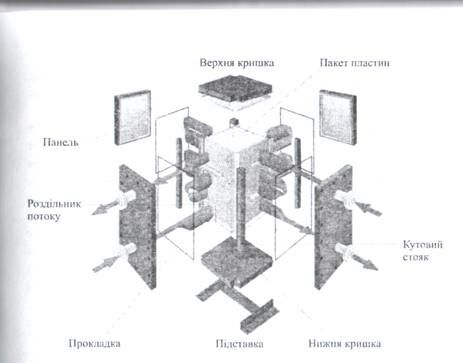 1 – неподвижная плита; 2 – гофрированная теплообменная пластина; 3 – прокладка; 4 – конечная пластина; 5 – движущаяся пластина