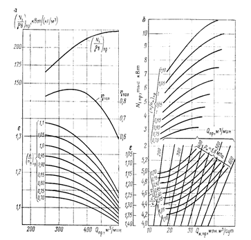 Рис. Приведенные характеристики нагнетателя 370-14-1. Условия приведения: Rпр=500 Дж/(кг·К); Тв.пр = 288 К; zв. пр = 0,91 и пн=5300 1/мин |