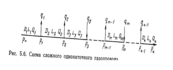 Газопроводы, отличающиеся от простых, т. е. однониточных постоянного диаметра, будем называть сложными. Таковыми являются многониточные газопроводы, газопроводы с лупингами, газопроводы, состоящие из последовательно соединенных участков различного диаметра. К сложным будем относить также газопроводы, имеющие путевые отборы или подкачки.