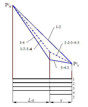 Если лупинг соединен лишь с частью параллельных ниток (рис. 5.9) или лишь с одной из них, то линия падения квадратов давления у ниток, связанных с лупингом, будет с изломом (в точке подключения лупинга), а у «свободных» ниток – без излома.