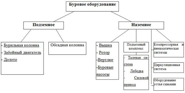 Буровые установки предназначены для сооружения скважин. Конструкция скважины во многом определяет типоразмер БУ. Буровая установка состоит из отдельных сооружений, агрегатов и механизмов. Процесс бурения представляет собой отдельные последовательные или повторяющиеся операции, которые выполняет буровая бригада с помощью механизмов. По функциональному назначению всё оборудование можно условно подразделить на две группы: подземное и наземное. Если подземное оборудование предназначено непосредственно для бурения скважины, то наземное приводит его в движение и обслуживает его работу.