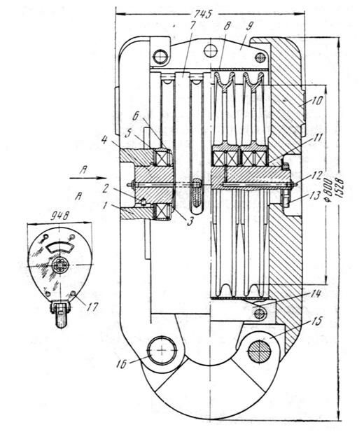 1, 10 – щеки; 2 – штифт; 3, 6, 11 – кольца; 4 – ось; 5 – роликоподшипники; 7 – откидные кожухи; 8 – канатный блок; 9 – верхний щит; 12 – масленки; 13 – гайка; 14 – нижний щит; 15 – серьга; 16 – палец; 17 – болт