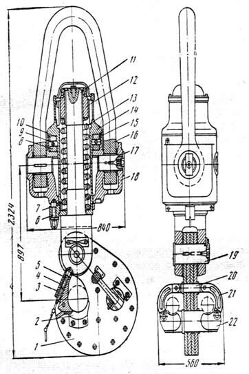 5 – стопор защелки; 6 – стопор стакана; 7 – пружина стакана; 8 – нижнее кольцо упорного шарового подшипника; 9 – шарики подшипника; 10 – верхнее кольцо подшипника; 11 – ствол; 12 – гайка; 13 – пружина; 14 – стакан; 15 – подшип- ник; 16 – штропы; 17 – ось; 18 – траверса; 19 – палец; 20 – ось крепления скоб; 21 – скобы; 22 – ось.
