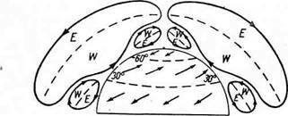 3) тропосферно-стратосферное кольцо, соединяющее два предыдущих кольца в единую систему. Стрелками показано направление циркуляционных движений, причем у экватора и 60-й параллели показаны восходящие движения воздуха, у 30-й параллели и полюса — нисходящие. Прерывистыми линиями внутри колец отделены  преобладающие  западные (W)  и  восточные (Е)  ветры.