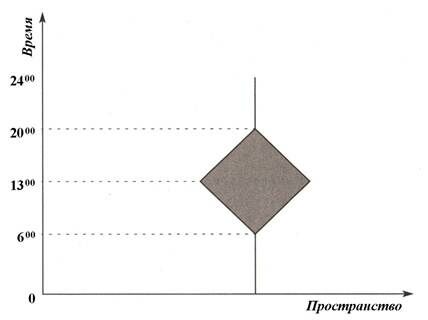 Так, в течение суточного цикла жизнедеятельности (если представить его графически) человек ограничен определенными линиями, за которые он не может переступить. Эти линии формируют своеобразные «острова», приобретающие в трехмерном пространстве-времени форму призмы (рис. 4.3). Они и становятся пространственно-временными ячейками человеческого бытия. В свою очередь ячейки образуют поселенческую общность людей, которая становится ядром социума. Границы этих ячеек определяются временными и транспортными возможностями, стабильностью суточного ритма, детерминированностью (предопределенностью) обыденного поведения человека, кругом его ежедневного общения и т. д.