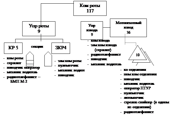 | Личный состав, основное вооружение | Управление роты | Три мотострелковых взвода, в каждом | Взвод оружия | Ремонтная секция | Итого в роте |