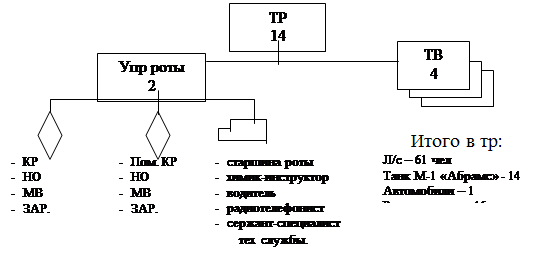 На базе танковой роты в бою может создаться ротная тактическая группа в составе двух тв, одного мпв и саперного отделения, которая может поддерживаться батареей 155-мм самоходных гаубиц и другими подразделениями.