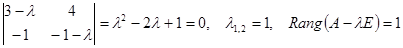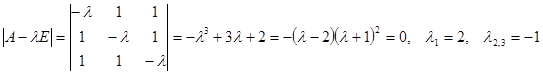 . Кратность корня равна 2. Ранг матрицы равен n-r = 3 – 2 = 1. Из полученного уравнения можно выбрать координаты двух линейно независимых векторов. Например,