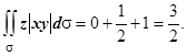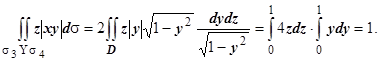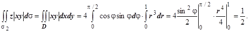 =0, поэтому поверхностный интеграл по s2 совпадает с двойным интегралом от функции z(x,y)|xy| = |xy|, взятым по кругу D ={x2+ y2<1}: