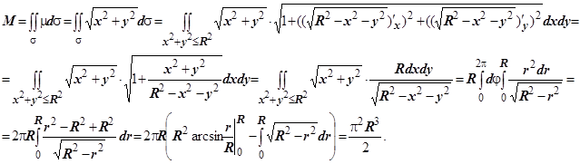 Пример. Найти координаты центра масс полусферы x2 + y2 + z2 = R2, z £ 0, если поверхностная плотность в каждой точке сферы равна расстоянию от этой точки до оси OZ.