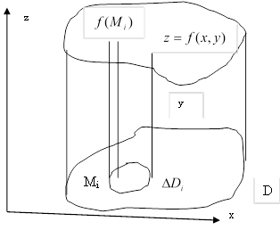 на области малого размера – организовать разбиение области на области – элементы разбиения. На каждом элементе отметим точку M(x,y) и построим над этим элементом прямой круговой цилиндр, высота которого постоянна для всех точек элемента и равна