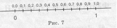 Каждой точке деления определим координату как показано на рисунке. Точно так же делим на десять частей любой другой отрезок, концы которого отмечены целыми числами. В результате на шкале появятся точки, отмеченные координатой с одним десятичным знаком после запятой.