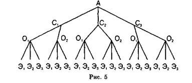 Из концов последних отрезков проведем еще три отрезка с концами Э1, Э2, Э3, которые указывают на назначение в группу одного из трех экспертов. Изображенную на рисунке схему и называют деревом. Всякий путь вдоль ветвей этого дерева от его вершины А к какой-либо вершине Э1, Э2 или Э3 изображает состав одной из оперативных групп. Например, путь АС2О1Э3 изображает оперативную группу, в которую включены следователь С2, оперативник О1 и эксперт Э3.