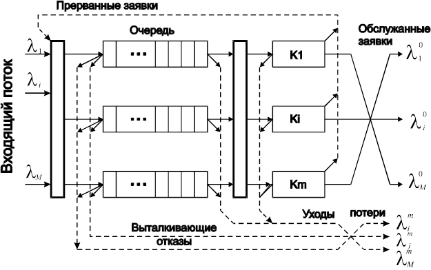 Поступающие на вход СМО однородные заявки в зависимости от порождающей причины делятся на типы, интенсивность потока заявок типа i (i=1…M) обозначено li. Совокупность заявок всех типов - входящий поток СМО.