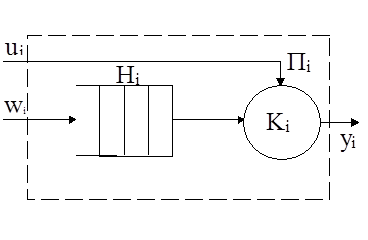 В любом элементарном акте обслуживания можно выделить две основные составляющие: ожидание обслуживания заявкой и собственно обслуживание заявки. Это можно отобразить в виде некоторого i-ого прибора обслуживания Пi, состоящего из накопителя заявок, в котором может находится одновременно li=0…LiH заявок, где LiH - ёмкость i-ого накопителя, и канала обслуживания заявок, ki.