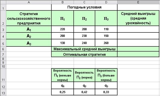 | Стратегия сельcкохозяй-ственного предприятия | П1 | П2 | П3 | Средний выигрыш (средняя урожайность) |