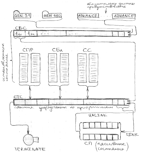 1. Список текущих событий. СТС, куда входят все события, запланированные на момент текущего времени не зависимо от того условные они или безусловные. Программа управления моделированием просматривает в первую очередь этот список и пытается переместить по модели те транзакты, для которых выполнены условия. Если в этом списке таких транзактов нет, то интерпретатор обращается к другому списку СПС перенося все события, которые запланированы на ближайший момент времени (время только модальное) из списка СПС и повторяет его просмотр. Такой перенос определяется так же в случае совпадения текущего времени моделирования со временем первого события в списке будущего события. В СПС транзакты размещены в порядке уменьшения приоритета. Транзакты с одинаковыми приоритетами размещаются в соответствии с последовательностью поступления в список. Каждый транзакт в списке может находиться или в активном состоянии и рассматривается интерпретатором в данный момент времени или в состоянии задержки.