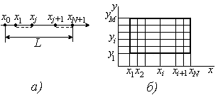 Для одномерных областей построение сеток мало чем отличается от аналогичной процедуры в МКР. Отрезок длиной L разбивается на N частей (рис. 1, а). Расстояние между двумя соседними узлами называется шагом сетки  при i=1, 2, ..., N. При регулярной сетке шаг  - постоянная величина, равная 1/(N-1), где N - количество узлов сетки.